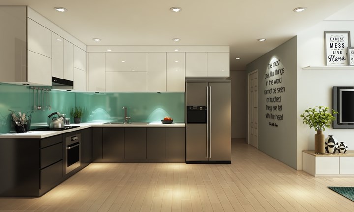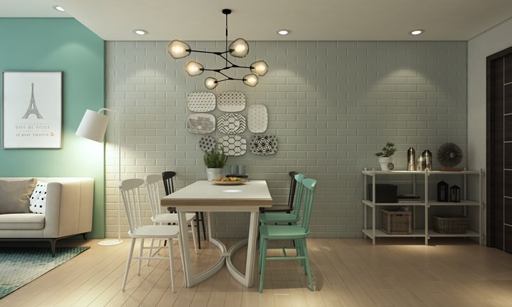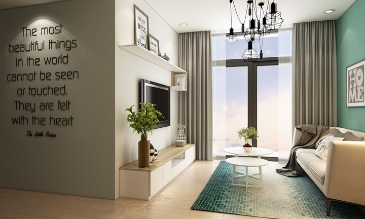 Trong một không gian có phần hạn chế, nhà thiết kế đã chọn màu sắc để làm công cụ phân biệt giữa các khu vực, ngoài ra bức tranh bằng chữ cách điệu cũng là bí quyết giúp phòng khách thêm phần nổi bật.