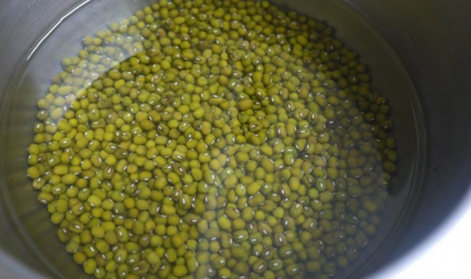 Đầu tiên, rửa sạch đỗ, loại bỏ những hạt lép. Tiếp theo, pha 3 bát nước lạnh với 2 bát nước sôi rồi ngâm 100gr đỗ xanh vào. Thời gian ngâm khoảng 1 giờ đồng hồ. Trong thời gian này, hãy chuẩn bị chai nước đã dùng (loại 1,5l), rửa sạch, đục khoảng 4 đến 5 lỗ ở nắp chai nước, đục thêm nhiều lỗ nhỏ nữa ở phần thân của chai. Đỗ xanh sau khi ngâm, bạn cho hết vào trong chai, đậy nắp lại.