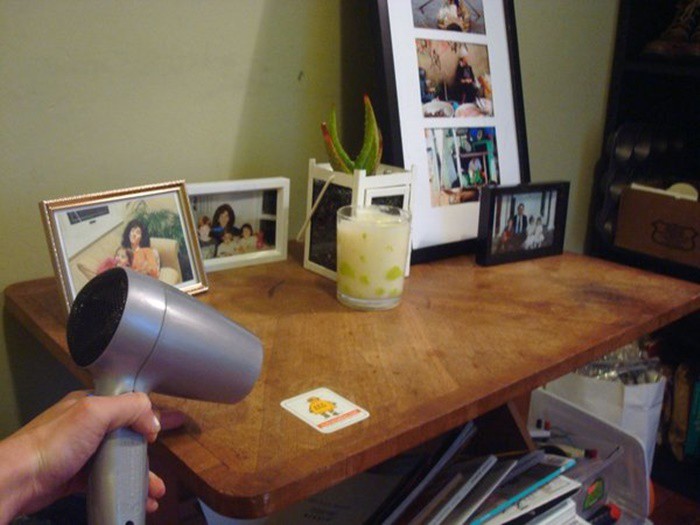 Khi mua bất kỳ sản phẩm hàng hóa nào cũng đều có tem nhãn. Điều khó chịu là chúng dính rất chắc vào sản phẩm nên khi bóc ra thường để lại dấu vết keo dán trông rất mất thẩm mĩ. Lúc này, máy sấy tóc sẽ phát huy tác dụng. Bạn hãy dùng máy sấy tóc xe hơi nóng vào lớp tem để phần keo dán chảy ra, sau đó bạn sẽ dễ dàng loại bỏ lớp tem này sạch sẽ, không để lại dấu vết.