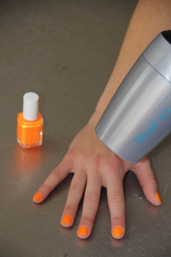 Nếu không đủ kiên nhẫn để đợi cho lớp móng tay vừa sơn thì bạn có thể dùng máy sấy xả hơi nóng vừa phải vào móng tay, đảm bảo chúng sẽ khô nhanh hơn bình thường.