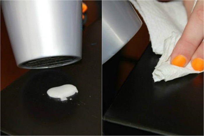 Nhà có con trẻ thì việc bị bôi bẩn lên tường là điều thật khó tránh khỏi. Những lúc như vậy hẳn nhiều người nổi giận lên vì không biết cách nào để làm sạch nó. Tuy nhiên, bạn chỉ cần dùng máy sấy tóc xả hơi nóng vào đó, đến khi sáp chảy ra bạn dùng khăn ẩm lau sạch đi.